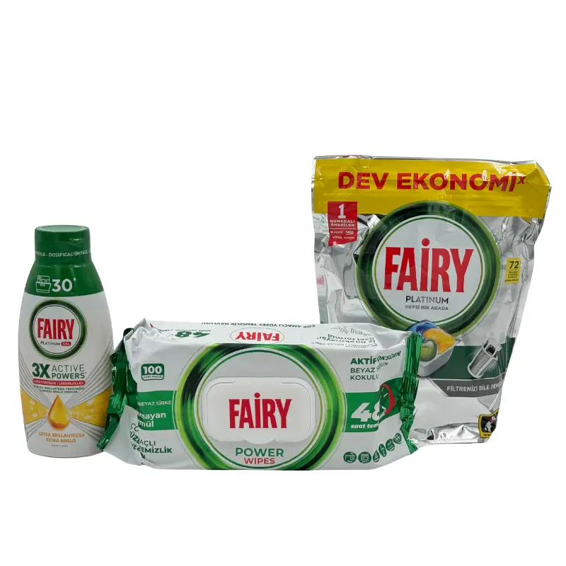 پک فیری فمیلی شامل: ژل ماشین ظرفشویی 600 میلیلیتر + قرص ماشین ظرفشویی 72 عددی + دستمال مرطوب چند منظوره فیری 100 تایی